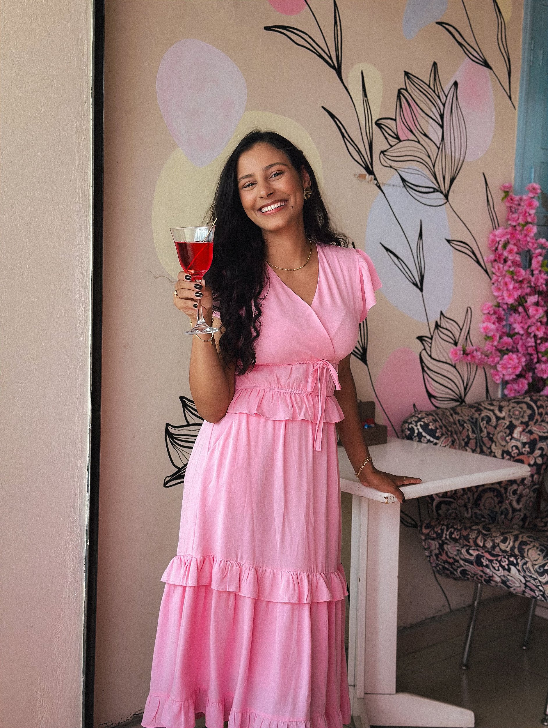 A saia conta com elástico nas costas, bolsos espaçosos e dois babados, garantindo movimento e um visual ainda mais feminino.